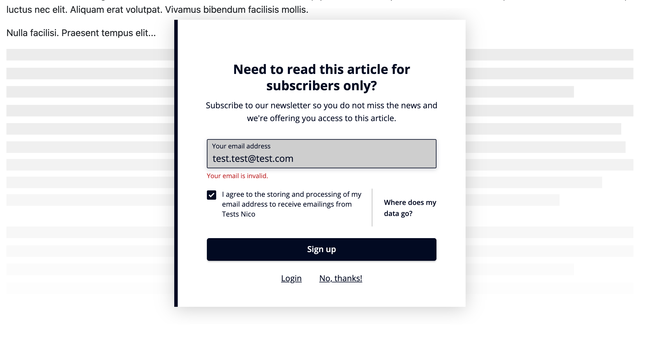 When you set up a newsletter widget via the Poool's dashboard, it is possible to define the texts, the appearance and some optional features such as the newsletter identifier etc.
